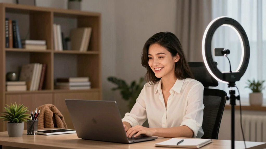 Ultimately, a good ring light can transform your video meetings from mediocre to memorable. It’s not just about looking good; it’s about creating a consistent and professional image that reflects your personality and expertise. By choosing the right affordable options and considering mobile setups, you can guarantee that you’re always ready to shine, no matter where you are. So, don’t underestimate the power of proper lighting—your digital presence will thank you!