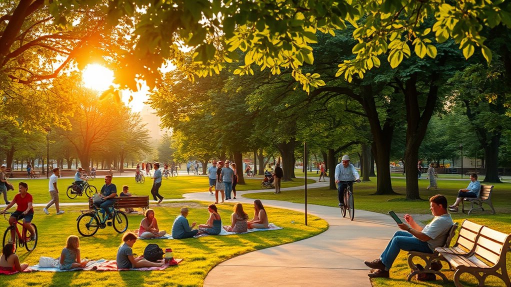 You might find that urban parks offer accessible, vibrant spaces for relaxation, fostering community bonds and diverse activities. Conversely, rural festivals provide a charming, immersive experience rooted in tradition, encouraging social connection and cultural appreciation. Urban environments often emphasize convenience and variety, while rural areas cultivate intimacy and authenticity. Both settings shape leisure opportunities uniquely, influencing how you unwind and connect, enriching your overall sense of well-being.
