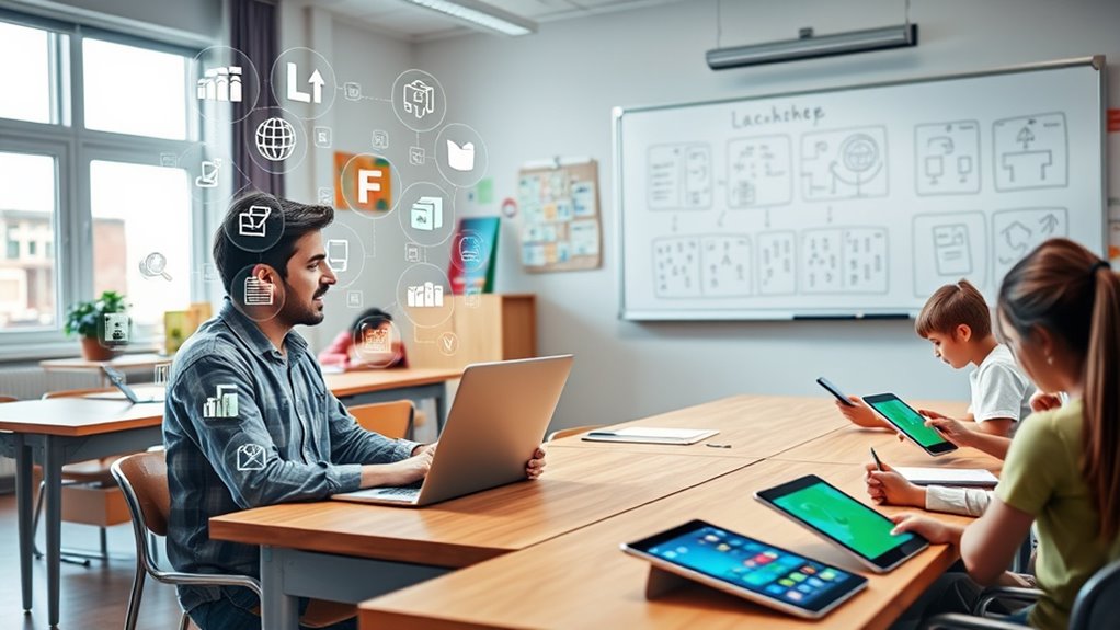As AI continues to evolve, it’s transforming teaching strategies by encouraging more personalized and adaptable approaches. You’ll find that AI-driven tools enable you to tailor lessons to individual student needs, fostering deeper engagement. These technologies promote flexible pacing, allowing students to progress at their own speed. AI also supports formative assessment, providing real-time feedback to guide instruction. As a result, your teaching becomes more responsive, addressing diverse learning styles effectively. AI’s ability to analyze data helps you identify trends and adjust strategies proactively. Over time, this leads to more effective, evidence-based practices. Additionally, AI can streamline routine tasks, freeing you to focus on relationship-building and creative teaching methods. Moreover, understanding Personal Finance Management principles can help educators plan for their financial future and incorporate financial literacy into their teaching. Ultimately, AI’s future impact will reshape classrooms into more dynamic, personalized learning environments.