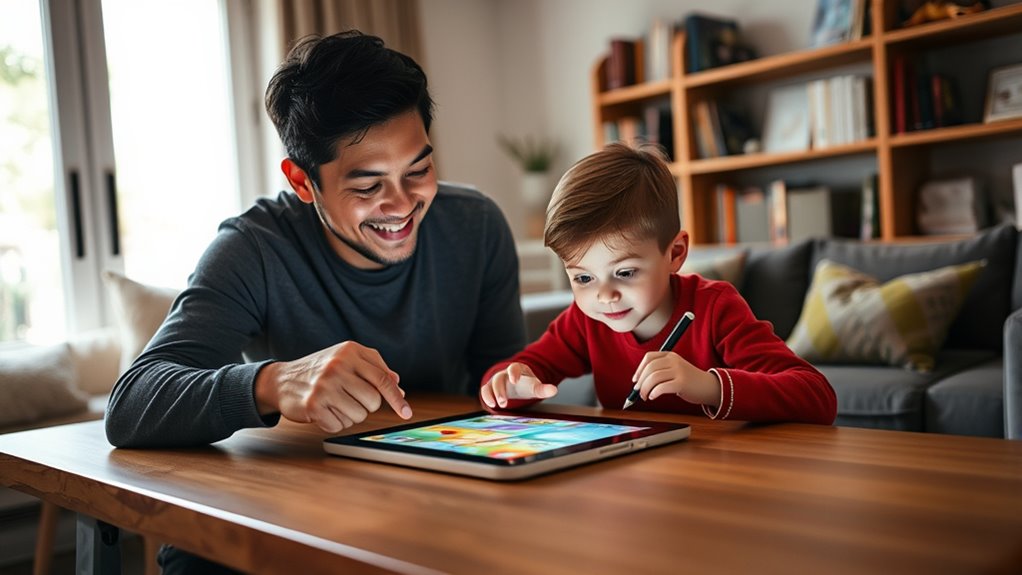 Building on the importance of early digital interactions, understanding your own attitudes toward technology plays a key role in guiding your child’s digital journey. If you’re unsure about the benefits or risks of digital tools, it can lead to inconsistent rules or mixed messages. Reflect on how you feel about screen time, digital learning, and online safety. Recognize that your perceptions influence your child’s digital habits more than you might realize. To build digital literacy, seek out reliable information and consider participating in parent-focused tech workshops or tutorials. By actively updating your digital skills, you demonstrate a positive attitude and model responsible technology use. Utilizing FAQs about digital education can also help clarify common concerns and strategies. This approach helps create a supportive environment where your child feels confident exploring digital spaces safely and effectively.