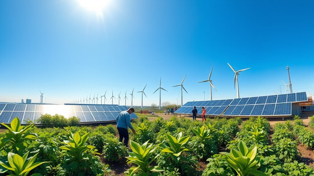 Building on supply chain efforts, leveraging innovation and policy support can accelerate your path toward net-zero. Embrace cutting-edge technologies like advanced renewable energy systems, energy storage, and smart grid solutions to enhance efficiency and reduce emissions. Advocate for policies that incentivize clean energy adoption, such as tax credits, subsidies, and stricter emissions standards, which create a favorable environment for sustainable investments. Collaborate with governments and industry groups to shape regulations that promote innovation and guarantee fair market access. Investing in research and development can open new low-carbon solutions, while policy frameworks provide the stability needed for long-term planning. Together, innovation and supportive policies enable you to overcome barriers, scale sustainable practices, and make meaningful progress toward achieving net-zero emissions.