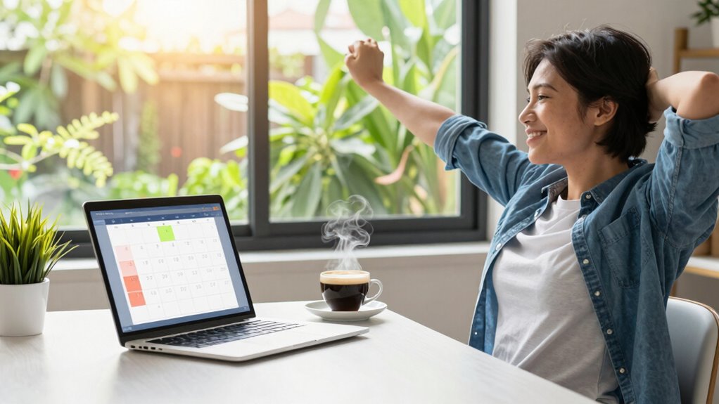 Yes, you should schedule mindful breaks during your high-energy periods. These breaks help you maintain energy management, preventing burnout and keeping you focused. By taking short, intentional pauses, you recharge mentally and physically, enhancing productivity. Incorporate activities like stretching, deep breathing, or quick walks to maximize the benefits. This mindful approach guarantees your energy stays balanced throughout the day, allowing you to work efficiently without feeling overwhelmed or fatigued.