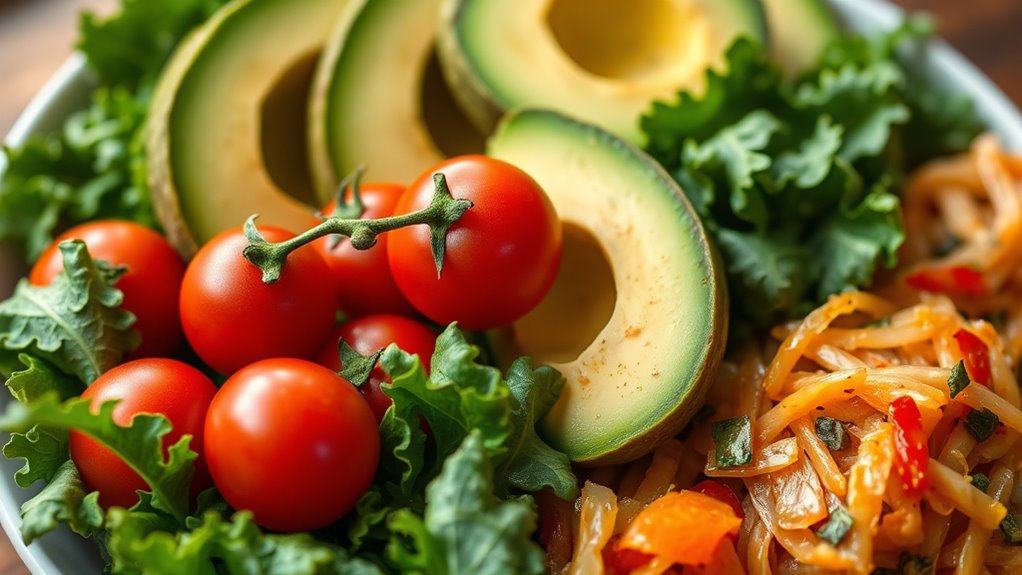 Consuming fermented foods is a practical way to boost your gut health and support a resilient microbiome. Fermented options like yogurt, kefir, sauerkraut, kimchi, tempeh, and miso introduce beneficial bacteria directly into your digestive system. These probiotics help diversify your gut flora, improve digestion, and strengthen your immune response. Incorporate fermented foods into your meals regularly, aiming for a variety of types to maximize benefits. Choose unpasteurized and minimally processed options to guarantee live cultures are preserved. You don’t have to overhaul your diet—adding a small serving daily or a few times a week can make a significant difference. Remember, fermented foods are an easy, delicious way to nurture your microbiome and promote overall well-being.