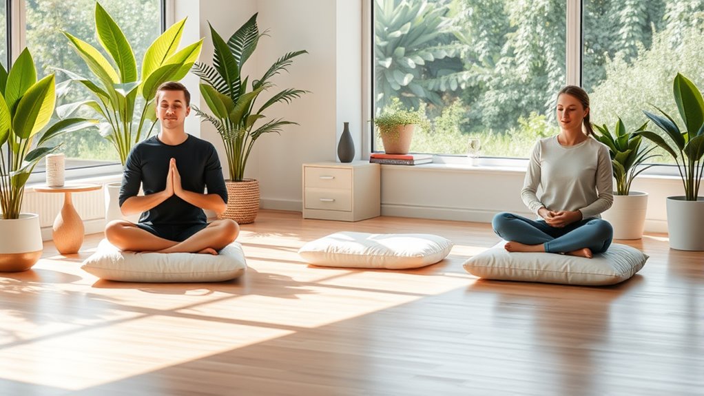 You might find that specific mindfulness techniques truly transform your remote team’s dynamics. Practices like guided meditations during virtual meetings, breathing exercises before vital calls, and digital detox breaks help reduce digital fatigue and boost focus. By incorporating these simple techniques consistently, you can foster a calmer, more connected team atmosphere, leading to increased productivity, better communication, and a stronger sense of well-being—even from afar.