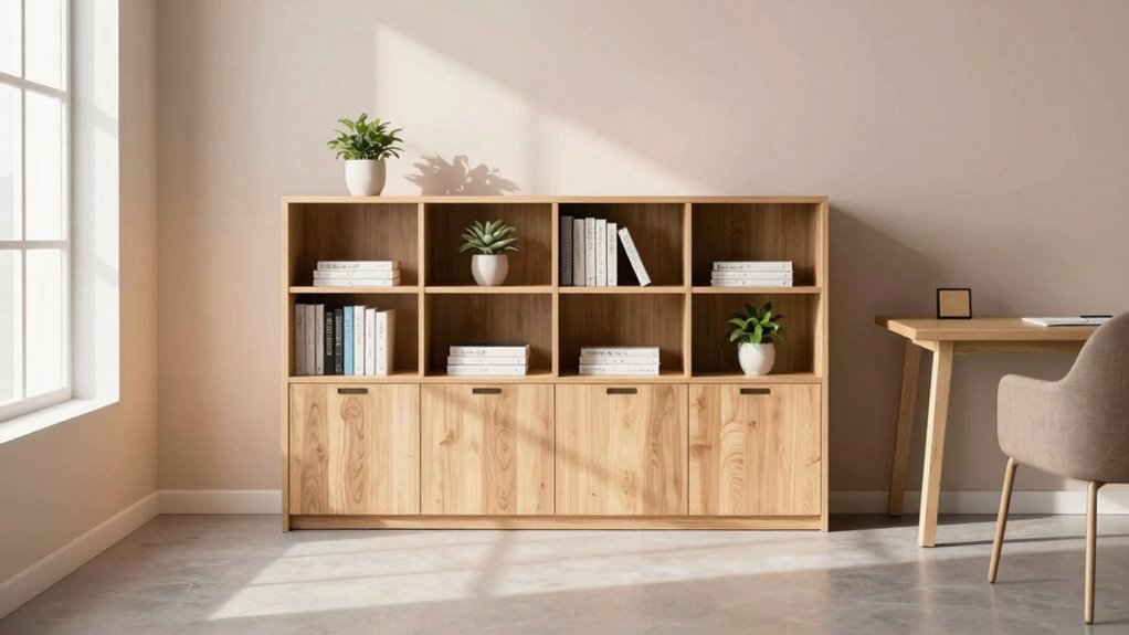 When choosing materials for office storage cabinets, consider wood alternatives like laminate or MDF, which offer durability and a polished look without the weight of solid wood. Metal finishes, like steel or aluminum, provide strength and a modern aesthetic, perfect for compact spaces. Both options resist wear and tear, ensuring your cabinets maintain their appeal over time. Plus, they’re often easier to clean, making your office environment more efficient and organized.