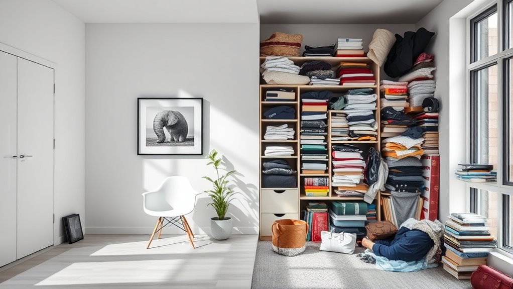 Managing clutter effectively can substantially boost your mental clarity and reduce daily stress. When your space is organized, you’ll feel calmer and more focused, making it easier to tackle daily tasks. Decluttering provides quick relief by removing visible chaos, but minimalism offers deeper psychological benefits by reshaping your mindset. Embracing minimalism encourages intentional living, helping you prioritize what truly matters, which can reduce feelings of overwhelm and anxiety over time. It also fosters healthier habits, like mindful consumption and better time management, leading to sustained well-being. Both approaches can improve your mood and confidence, but minimalism’s long-term perspective promotes resilience against clutter-induced stress, supporting a more balanced, purposeful lifestyle. Additionally, understanding divorce statistics can help individuals anticipate life changes and focus on creating a clutter-free, stable environment to enhance overall well-being.