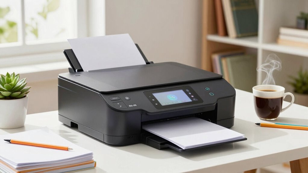 When you’re setting up your home office, an all-in-one printer scanner can truly boost your productivity. These devices save space and eliminate clutter by combining multiple functions in one unit. Look for models with robust wireless connectivity so you can print and scan from anywhere. Plus, high scanning resolution and duplex capabilities guarantee your documents are clear and efficiently processed. If you’re curious about top models and features, you’ll find plenty of options to explore.