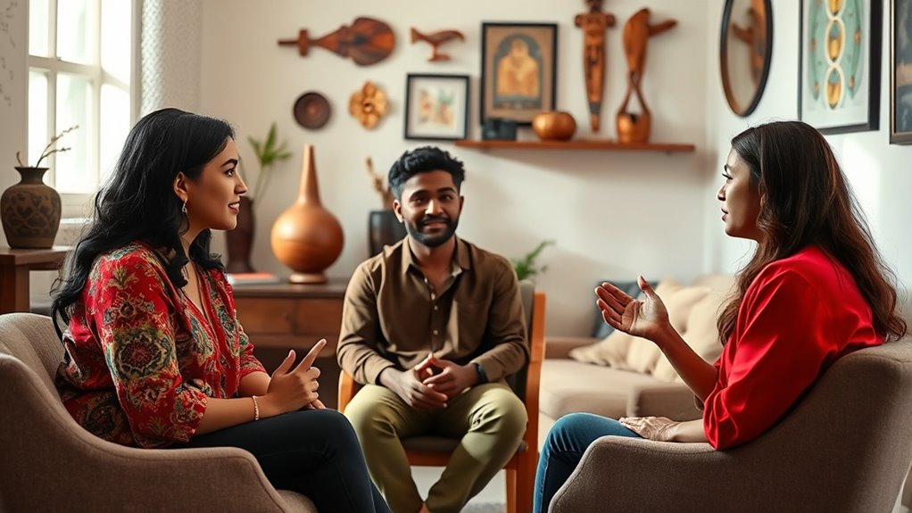 While fostering cultural sensitivity within organizations sets a strong foundation, practitioners still face significant challenges when applying cross-cultural therapy in real-world settings. You must navigate complex cultural dynamics, avoid stereotypes, and maintain cultural humility. Balancing respect for clients’ traditions with evidence-based practices can be difficult, especially when cultural values clash with therapeutic models. Additionally, limited training on diverse cultural factors like religion or socioeconomic status hampers your effectiveness. Moving forward, you should prioritize ongoing education, actively seek supervision, and incorporate client feedback. Developing flexible, culturally responsive techniques and advocating for systemic change are essential to overcoming barriers. Embracing these efforts guarantees you provide more equitable, respectful, and effective care, fostering genuine trust and positive outcomes across cultural boundaries. Recognizing the importance of cultural competence can help deepen your understanding and improve your therapeutic approach.