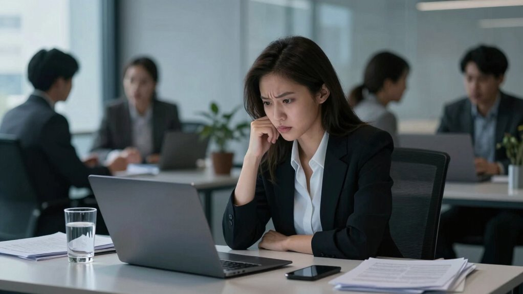 You might notice early signs of workplace self-doubt when you hesitate to share ideas or second-guess your decisions. You could feel anxious or overwhelmed, which affects your confidence building efforts. To combat this, focus on stress management techniques like deep breathing or mindfulness. Recognizing these signs early helps you address them promptly, boosting your confidence and helping you stay engaged and proactive in your work.