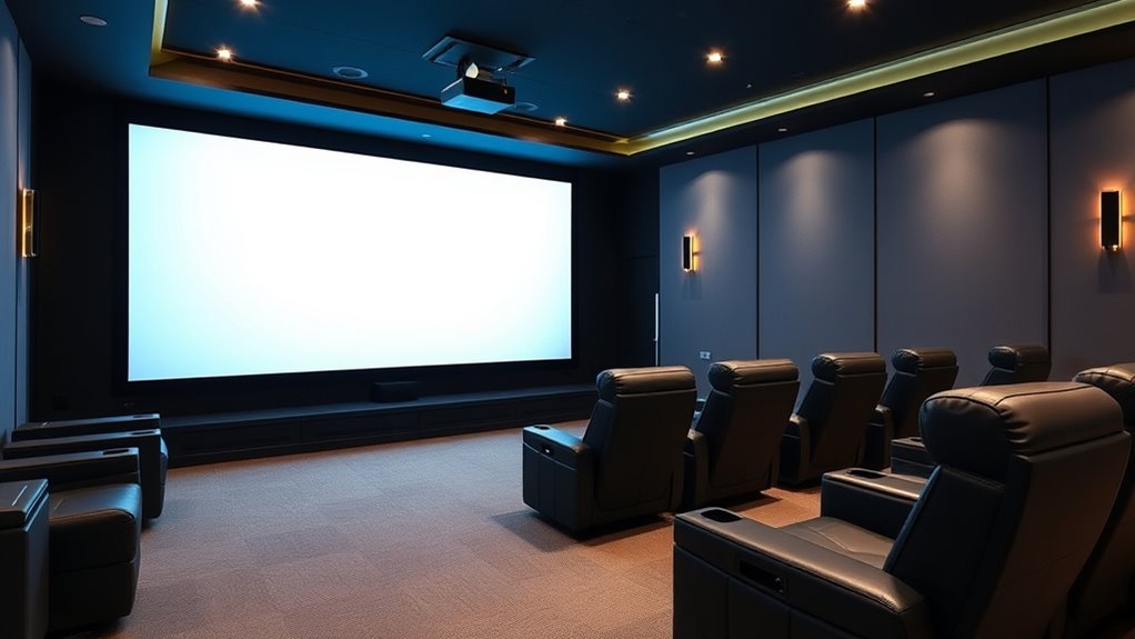 To guarantee your home theater looks stunning, it’s essential to match the projector’s maximum screen size with your room’s dimensions. Check the throw distance specifications to ensure the projector can produce a large enough image within your space. Many projectors feature adjustable zoom and keystone correction, allowing you to fine-tune the image size and alignment for your room’s layout. If your room is spacious, opt for a projector with higher brightness levels (lumens) to keep the picture clear and vibrant. Proper placement and mounting options are also vital to achieve the desired screen size without distortion. By considering these factors, you’ll ensure your projector fits perfectly, delivering an immersive viewing experience tailored to your room’s size.