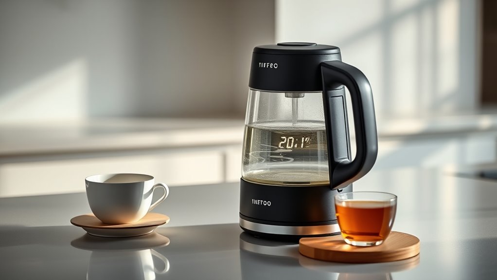 The level of temperature precision in an electric kettle considerably impacts how accurately you can brew your favorite beverages. Different kettles offer various increments, from 1-degree to 5-degree adjustments, affecting brewing accuracy. Precise control with digital displays allows me to set and monitor water temperature easily, ensuring consistency. Some models include preset options for specific drinks like tea, coffee, or baby formula, which helps streamline the brewing process. Adjustable settings give me the ability to fine-tune the water temperature for ideal extraction, especially important for delicate teas or specialty coffees. Higher precision levels provide better control over flavor and quality, making them suitable for connoisseurs who appreciate the nuances of their brews. Ultimately, choosing a kettle with the right temperature accuracy enhances the entire brewing experience.