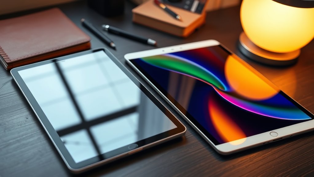If I were choosing between the iPad Pro 2025 and the iPad Air for students, I’d weigh performance and budget carefully. The iPad Pro offers top-tier power, larger display, and better connectivity options, making it ideal for demanding tasks and creative projects. The iPad Air, however, is more affordable, lightweight, and perfectly suitable for everyday use and moderate work. Want to find out which features truly stand out? Keep exploring to see which fits your needs best.