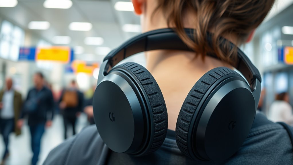 Choosing the right connectivity options is essential for hassle-free travel with noise-canceling headphones. I look for headphones that support Bluetooth 5.0 or higher to guarantee a stable connection, especially in busy environments. It’s also smart to choose models with a wired mode, like an AUX input, in case wireless connections drop or batteries run out. Multipoint pairing is a big plus, letting me connect to multiple devices, like my phone and tablet, without needing to disconnect and reconnect each time. I also check the wireless range—about 10 meters is ideal—to prevent disconnections as I move around. Ultimately, broad device compatibility with various operating systems guarantees I can easily connect no matter what device I’m using during my travels.