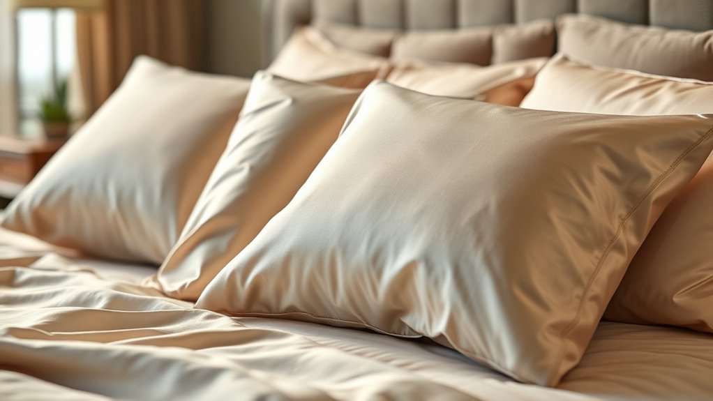 Silk pillowcases offer notable skin benefits that make them a smart choice for better sleep quality and skin health. They help maintain skin hydration by reducing moisture absorption, unlike cotton, which can lead to dryness and fine lines. The smooth surface minimizes friction, decreasing sleep-induced creases and wrinkles. Silk contains amino acids that support skin cell metabolism, promoting a more youthful complexion. Additionally, silk reduces skin irritation and acne caused by friction and static buildup from rougher fabrics. Its breathable, cool properties help regulate body temperature during sleep, preventing overheating and excessive sweating. All these factors combine to enhance your skin’s overall health and appearance, making silk pillowcases an excellent investment in your nighttime skincare routine.
