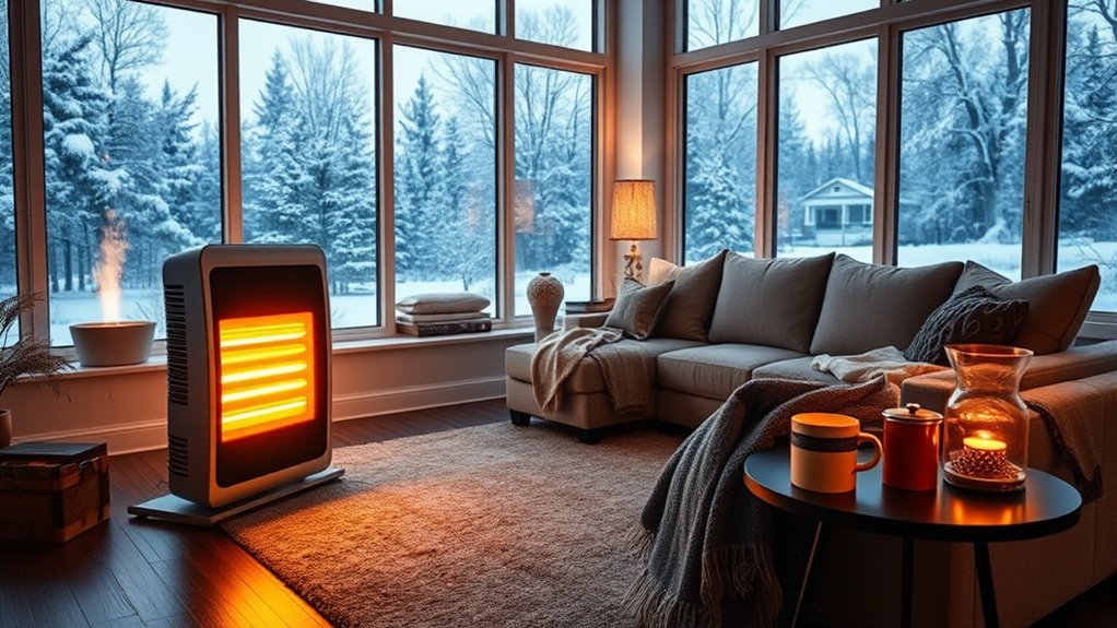 Imagine my family gathered in our spacious living room, and suddenly, the heater shuts off because of a safety feature. Yes, large room heaters often include safety features like tip-over shutoff, overheat protection, and cool-to-the-touch exteriors. These features prevent accidents and give me peace of mind, especially with kids around. I always look for models with these safeguards to guarantee safety without sacrificing warmth.