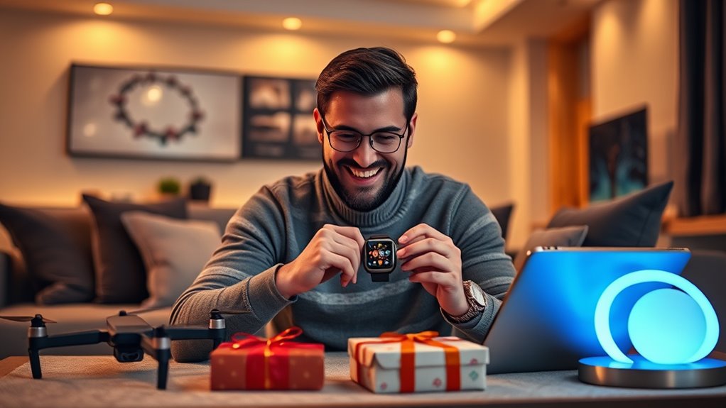 Choosing the right tech gift for Dad in 2025 requires considering the occasion to guarantee it’s appropriate and meaningful. Think about whether the gift suits the event—practical gadgets for Father’s Day or fun novelty items for birthdays work best. It’s also important to match the gift’s interests, like gaming, photography, or DIY projects, ensuring it resonates with Dad’s hobbies. Consider the formality of the occasion—professional accessories for work events or casual gadgets for relaxed gatherings. Timing matters, too—will Dad use it immediately or cherish it as a long-term keepsake? Ultimately, check if the gift aligns with any themes or traditions, such as holiday designs for Christmas or personalized touches for milestones. When in doubt, choosing an occasion-appropriate gift adds thoughtfulness and enhances its value.