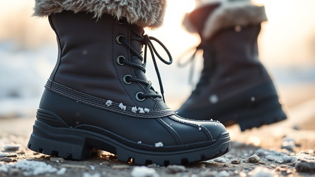 Ensuring good traction and grip is essential for safe walks through icy or snowy conditions. I look for snow boots with soles made from rubber or slip-resistant materials to prevent slips. Deep lug patterns on the outsole improve stability and grip on snow and ice. Advanced traction technology, like multi-directional treads, offers extra slip resistance, which is a real game-changer. A textured or rugged sole design helps increase surface contact, reducing the risk of slipping. Properly engineered tread depth and pattern are vital for maintaining grip in various winter conditions. When choosing snow boots, I prioritize those with these features because they give me confidence and safety when walking on slippery, icy surfaces. Good traction truly makes all the difference in winter footwear.